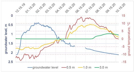 Figure 5 shows the groundwater level and ground temperatures at three depths for the period from December 2019–October 2020 in the borehole 3/16-S.
