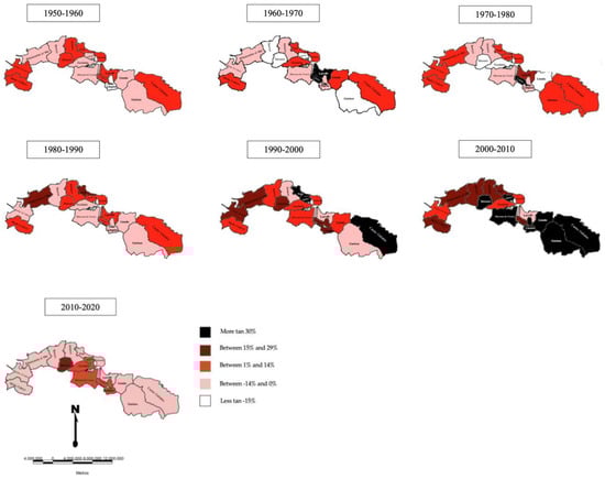 The population evolution, of course, has not been followed in the same way by all the municipalities that make up the Marina Oriental, since each one has had its internal trend, although they were in general, similar, especially until the end of the twentieth century (Figure 5).
