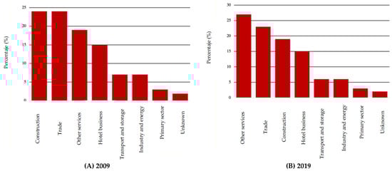 As for the business structure of the activity between 2009 and 2019, most of the establishments are focused on repair (more than 2500 establish-ments), construction (more than 2000), and hospitality (almost 1500). With the compa-nies, we see a significant percentage of them in 2009 corresponding to construction and trade, both close to 25% of the total companies of the Marina Oriental, followed by the rest in services, with almost 20%. In 2019, the situation varied a little, since the largest percentage correspond to the rest of the services, exceeding 25%, with trade and construction decreasing in importance, the latter below 20% (Figure 6 and Table 1).