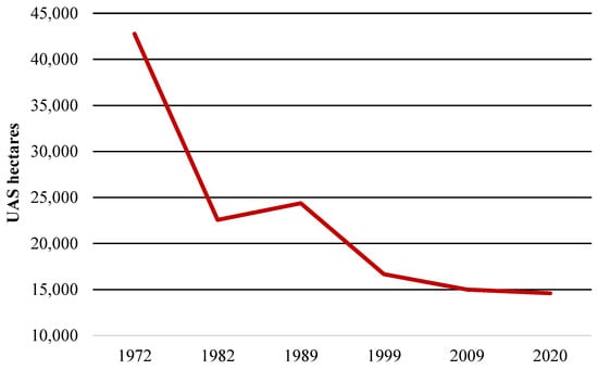 Everything mentioned above also translates into a reduction in the useful agricultural area occupied by these farms, which, of course, has been reduced. The useful agricultural area has gone from exceeding 42,000 hectares for the whole of the Marina Oriental in 1972 to standing at just over 14,000 by the year 2020 (Figure 7). If it is analyzed at the municipal level, it can be seen how the reduction has been very intense between 1972 and 2020, with municipalities that have practically completely lost their agricultural use area, such as Santoña, Liendo, Guriezo, Noja or Castro Urdiales, with reductions of around 98%.