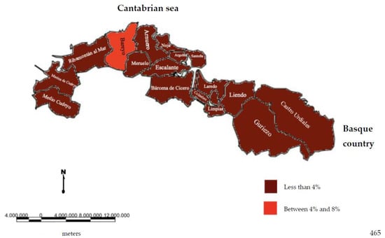 Internal differences can be seen within the study area. On the one hand, municipalities that from 1999 to 2019 have greatly decreased the number of employees in the sector, such as Argoños (from 6% to 4%), Colindres (from 14% to 6%), Guriezo (from 7% to 1%), Laredo (from 11% to 3%), or Santoña (from 16% to 6%), taking into account that in Colindres, Laredo, and Santoña, many of the employees in the primary sector are not agricultural but fishing. On the other hand, the westernmost municipalities increased the numbers of agricultural employees between these dates, such as Arnuero (from 0% to 3%), Bárcena de Cicero (from 2% to 4%), Escalante (from 2% to 4%), or Ribamontán al Mar (from 0% to 5%).
