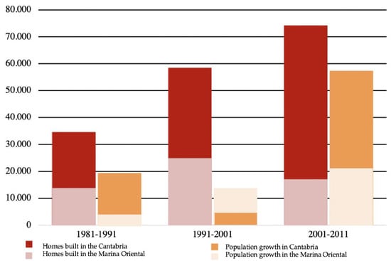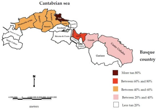 There has been remarkable population growth in the study area, earlier in some municipalities than in others [32]. Firstly, in municipalities such as Noja, which has gone from 1300 inhabitants in 1980 to 2100 in 2001, Laredo or Castro Urdiales (from 13,050 inhabitants in 1980 to 21,081 in 2001), in the last years of the twentieth and in the early twenty-first century. Then, after the first years of the XXI century, in municipalities such as Colindres (from 6900 inhabitants in 2001 to 8100 in 2011), Meruelo, and Bárcena de Cicero (from 2400 inhabitants in 2001 to 4100 in 2011), which, after the previous growth of the nuclei mentioned in the first place and being located very close to them, tend to grow later.