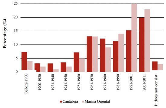As can be seen in the graph (Figure 10), the main growth in the housing stock in Cantabria and in the Marina Oriental has occurred during the last decades in proportions higher than the increase in the population.