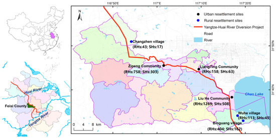 - National Research Center for Resettlement. Supervision and Evaluation Report on the Restoration of Resettlers’ Production and Living Standard: “Yangtze to Huai River Inter-Basin” Water Diversion Project (Anhui Province Section); Research Report; National Research Center for Resettlement: Nanjing, China, 2017. [Google Scholar]