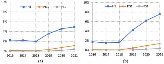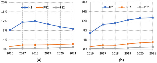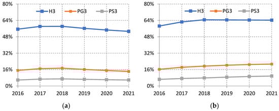 When is used as the poverty line, the consumption poverty incidence, consumption poverty gap and consumption poverty severity can be obtained. These are represented by , and , respectively. Their inter-temporal calculation results are shown in Figure 4. It can be seen from Figure 4 that the of both the urban and rural resettlers exceeded 50%, which is far greater than their and , indicating that all the resettlers generally relied on overdrafts. The of both the urban and rural resettlers increased between 2016 and 2018, indicating that their overall consumption demand relative to their income increased during this period. However, between 2018 and 2021, the of the rural resettlers declined, while that of the urban resettlers remained unchanged, indicating that rural resettlers’ overall consumption demand relative to their income declined, while urban resettlers’ overall consumption demand relative to their income remained unchanged. and basically showed the same trend as for both the urban and rural resettlers.