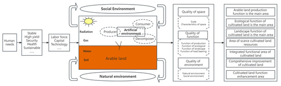 Cultivated land forms the material basis for the survival and development of human society. During the different periods of social development, there have been different concepts of the quality of cultivated land, from a single objective of crop production capacity and basic land capacity in the preliminary exploration stage to a comprehensive evaluation of productivity, suitability, carrying capacity, ecological security, environmental health and social development in more recent times (