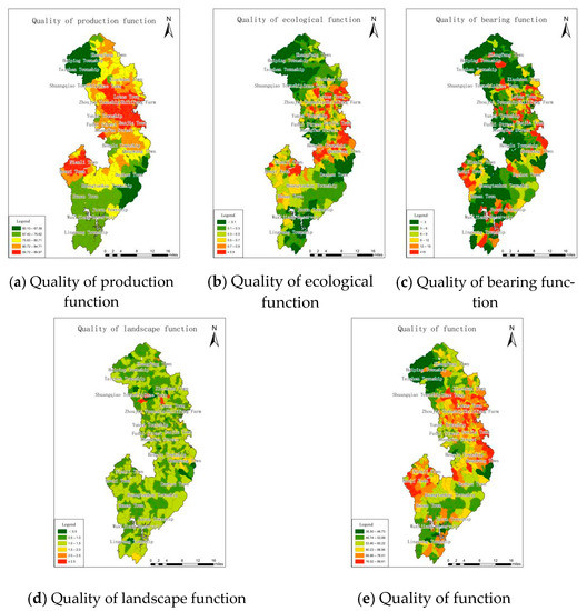 In this study, the indicators for measuring cultivated land function quality included production function quality, ecological function quality, landscape function quality and carrying function quality, which were mainly determined by 13 factors such as soil organic matter content, soil pH, atmospheric regulation and population carrying capacity. The score for the quality of the production function was divided into five grades by the natural breaks method, while the quality of ecological function, landscape function and carrying function was calculated by relevant models, and the quality was divided according to the rating standards. The high-quality area of cultivated land production function in Qujiang District was located in the middle, while the low-quality area was mainly located in Huiping Township and Taizhen Township. The high-quality areas of ecological function and landscape function were scattered over the central plain area, and the high-quality areas of carrying function were scattered over the whole area. The overall ecological function, landscape function and carrying function quality of Qujiang District were relatively low (