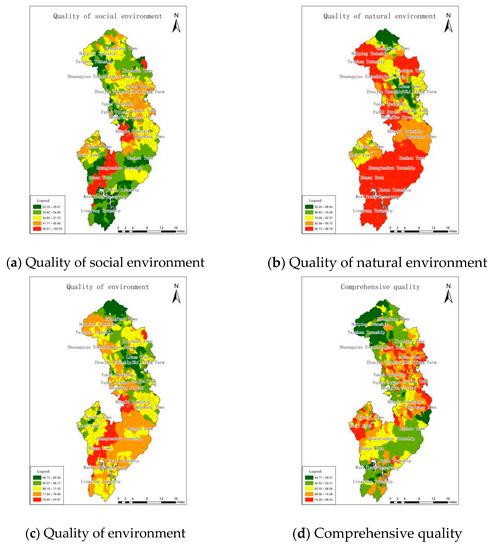 In this study, the indicators used to measure the environmental quality of the cultivated land included social and natural environmental quality, which were mainly determined by five factors: the residue of agricultural fertilizer, the accessibility of roads in the field, heavy metals in the soil, white pollution and earthworms in the soil. The scores for the quality of the social environment and the quality of the natural environment were divided into five grades using the natural breaks method. The high-quality area of cultivated land with regard to the social environment in Qujiang District was located in the south–central part, while the low-quality area was mainly located in the south. The overall quality of the natural environment in the Qujiang District was relatively high, although was relatively low in the central and northernmost areas (