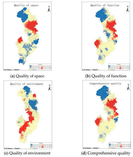 The distribution of the cold and hot spots of cultivated land space quality, functional quality and comprehensive quality was basically consistent. The center part was the hot spot area, the northwest was the cold spot area, while the hot spot area of environmental quality was located in the southwest, and the cold spot area was located in the center and northeast.