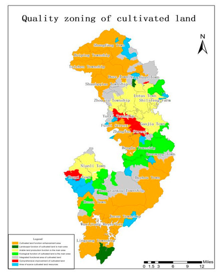 The cultivated land quality evaluation results based on the space–function–environment have a supporting role in the development of modern agriculture. The cultivated land with good space quality is suitable for large-scale mechanized agricultural operation, the cultivated land with moderate space quality can be used for small-scale mechanized agricultural operation and the cultivated land with poor space quality is not suitable for mechanized operation. The cultivated land with high functional quality is suitable for the development of food, cash crops, tourism and other industries. The cultivated land with poor functional quality should identify its limiting factors and improve the functional quality of its cultivated land. The cultivated land with high environmental quality can produce high-grade organic agricultural products, as well as pollution-free agricultural products, while the cultivated land with poor environmental quality needs to strictly prohibit or restrict the production of edible agricultural products, and switch to industrial grain production or flower cultivation. The cultivated land with high comprehensive quality of space–function–environment should be classified as permanent basic farmland.