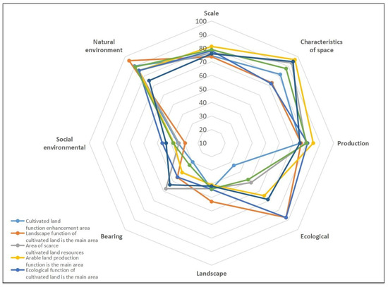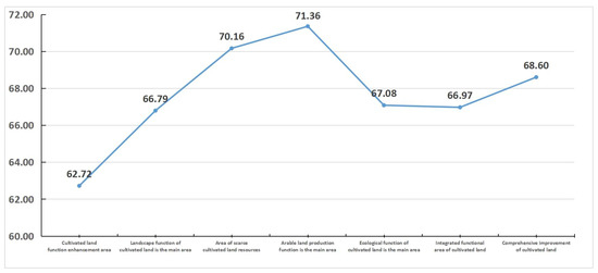 Figure 7): the main area of production function, the main area of ecological function, the main area of landscape function, the area of resource tension, the comprehensive functional area, the comprehensive rehabilitation area and the area of function improvement. The comprehensive quality score of cultivated land in each type of area is shown in