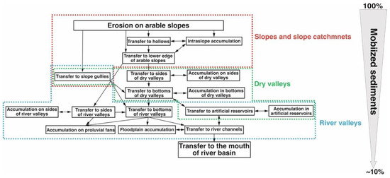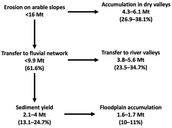 The proportion of sediments that entered the valley bottom network was about 61.6%. We based this estimation on the values of the sediment delivery ratio (SDR) for slopes of different morphologies, which we obtained after the generalization of several observations [134] and the morphometric analysis of the relief of the Plava River basin [133]. A total of 38.4% of all the mobilized sediments were redeposited on the slopes, which amounted to 6.1 × 106 t.