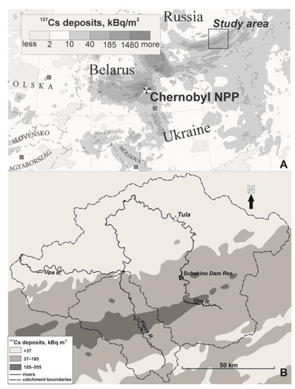 (A) Location of study area within Chernobyl-affected area [92]; (B) radioactive contamination along Upa River.