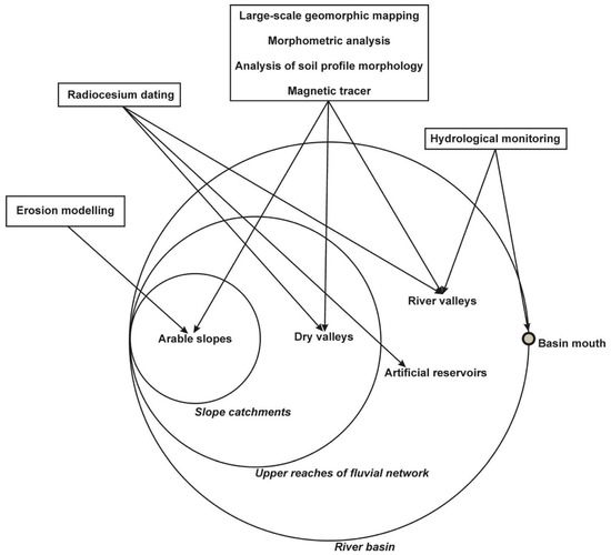 The active use of coal as a fuel during the growth of industrial production and the development of railway transportation led to the intense emissions of their combustion products into the environment [116], which we can now use as chronological markers for dating sediments [117]. The method is based on the assumption that the mass of the magnetic tracer redistributed as a result of erosion is directly proportional to the mass of the redistributed soil material. Researchers found a clear reduction in the contents of magnetic particles in the eroded soils of cultivated slopes in comparison with the soils of undisturbed slopes, where they did not observe any runoff [118]. The temporal coverage of the magnetic tracer method in the basin of the Upa River is about 150 years old; however, it is strongly limited by the proximity to the locations of the railways that were operating at the time. The joint use of the magnetic tracer method together with the radiocesium technique is a good approach to assessing the erosion and accumulation rates for the different time windows [119,120,121].