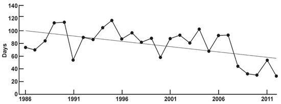 Duration of floods on Upa River (Orlovo gauging observation point). Straight sloping line indicates change trend [81].
