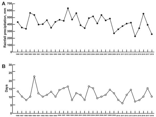 (A) Precipitation layer of warm seasons for 1986–2018; (B) number of wettest days during which more than 50% of the rainfall fell, according to data from Plavsk weather station.