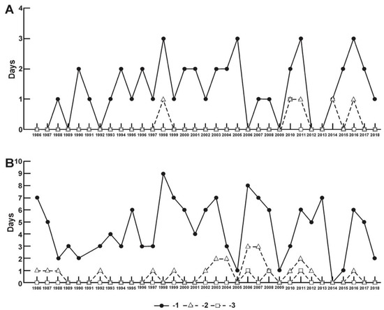 Number of days with rainfall of different intensities in (A) May and (B) August–September for 1986–2018: 1: >10 mm; 2: >30 mm; 3: >50 mm.