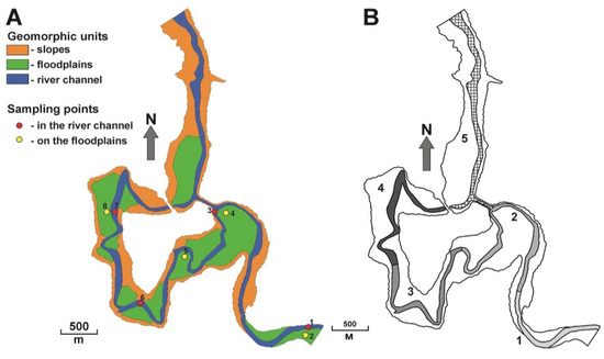 Upon reaching the river valleys, the material can either be deposited in the form of plumes or proluvial fans on the surface of the floodplain or reach the river channel. Furthermore, the eroded material continues to become part of the river sediment. Partial sediments are redeposited onto the surface of the floodplain during periods of rising water levels (floodplain accumulation). The reverse process (the transfer of matter from the floodplain to the channel) is also not excluded. However, under the conditions of the decreasing volume and duration of the flooding [81], this is only a marginal component of the sediment budget.