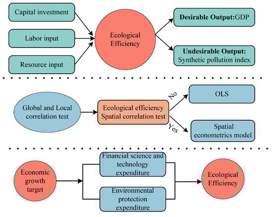 Government expenditure can effectively affect ecological efficiency. With regard to government fiscal expenditure preferences, the first generation of fiscal decentralization theory believes that residents “vote with their feet” and flow into areas that can provide them with satisfactory public goods []. The government has incentives to optimize public services within its jurisdiction, so as to achieve effective allocation of resources. The second generation of fiscal decentralization theory, from the perspective of principal–agent, believes that local governments, as rational people, have incentives for their own interests that are contrary to the public interest [], which is more in line with China’s reality. According to most studies, a high economic growth target would lead to distortions of local government expenditure structures. The government was under the pressure of stable growth when the market-driven growth rate fell below the economic growth target, which encouraged local governments to promote economic growth. The economic growth target can only be achieved through expenditures on economic affairs rather than public services, health, and education []. Local governments typically chose infrastructure construction or other methods that can achieve economic growth targets in a short period of time to achieve a challenging economic growth target, which caused improper allocation of resources and slashed investments in science and technology. Meanwhile, the governments emphasized that investing in capital-intensive and labor-intensive industries impeded the development of knowledge-intensive industries []. In terms of innovation, the relationship between economic growth target setting and innovation has not yet been agreed upon by scholars, which can be roughly split into promotion theory and inhibition theory. For example, Liu et al. believed that the economic growth target can effectively improve the green urban land-use efficiency []. According to Li et al., local government economic growth targets constrained enterprises’ technological innovation []. Economic growth targets hindered the improvement of green innovation efficiency through fiscal expenditures and market segmentation []. Expenditures directly related to the improvement of ecological efficiency are, respectively, fiscal science and technology expenditure and energy conservation and environmental protection expenditure. Energy conservation and environmental protection expenditure will certainly fill the space for local government environmental governance, enrich the scope and means of governance, and improve environmental quality []. However, it will also squeeze funds for production and economic growth. Fiscal expenditure on science and technology mainly refers to the fiscal revenue used to achieve the targets of scientific development, technological transformation, and innovation, reflecting the support of the central or local governments for science and technology activities []. It can provide strong support for scientific and technological innovation activities, so as to improve the level of ecological efficiency. Energy conservation and environmental protection expenditure has the effect of pollution control, and as an input type of environmental regulation it can guide society to increase environmental protection efforts, which is conducive to environmental protection and ecological efficiency, and improve the public service level of the jurisdiction. The above public services can not only improve people’s livelihood and welfare but also improve regional ecological efficiency. Government financial expenditure on science and technology can guide and promote industrial development, promote enterprise technological progress, and improve total factor productivity and has leverage and spillover effects on enterprise innovation []. Due to the mutual imitation and benchmarking competition strategy between local governments, China’s fiscal expenditure on science and technology has shown an upward trend []. As barriers between regions are gradually broken, capital, labor, and other factors flow among regions, and ecological efficiency and fiscal expenditure have spatial spillover effects; building a spatial measurement model has become the main method to explore green innovation and other influencing factors []. There is financial competition, imitation, and interaction among local governments in China. Therefore, spatial factors should be taken into account when analyzing China’s financial expenditure behavior [].