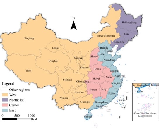 To reflect the social and economic development of different regions, the State Council of China has divided China’s economic regions into four: the east, the middle, the west, and the northeast (Figure 2). Among them, the eastern region includes Beijing, Tianjin, Hebei, Shanghai, Shandong, Jiangsu, Zhejiang, Fujian, Guangdong, and Hainan; the central region includes Shanxi, Anhui, Henan, Jiangxi, Hunan, and Hubei; the western region includes Inner Mongolia, Guangxi, Chongqing, Sichuan, Guizhou, Yunnan, Tibet, Shaanxi, Gansu, Qinghai, and Ningxia; Northeast China includes Liaoning, Jilin, and Heilongjiang.