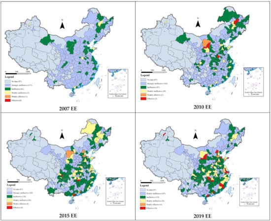 ArcGIS was used to map the spatial and temporal distribution of ecological efficiency in 2007, 2010, 2015, and 2019 (Figure 3). In order to better compare the changes of ecological efficiency, this paper classifies the ecological efficiency. Because the natural breakpoint method of ArcGIS is used, which makes different time points incomparable, this paper classifies the ecological efficiency by combining the natural breakpoint method and the equal division method. The ecological efficiency is divided into five types, that is, strongly ineffective (0, 0.4), ineffective (0.4, 0.6), weakly ineffective (0.6, 0.8), weakly effective (0.8, 1.0), and effective (1.0, 1.2). It can be seen from Figure 3 that the level of ecological efficiency of cities in China is rising and showing differentiation. In terms of time dimension, the level of ecological efficiency of cities is basically rising. Among them, the number of cities with strongly ineffective ecological efficiency decreased significantly, from 217 in 2007 to 107 in 2019. The number of cities with ineffective, weakly ineffective, and weakly effective ecological efficiency increased year by year. The number of cities with ineffective ecological efficiency decreased from 217 in 2007 to 107 in 2019. The number of cities with weakly ineffective ecological efficiency increased from 5 in 2007 to 36 in 2019, from 1 in 2007 to 6 in 2019, and from 0 in 2007 to 16 in 2019. In terms of spatial dimension, the ecological efficiency levels of Chinese cities are distributed differently, showing the characteristics of high in the east and low in the west as a whole. The cities with ineffective ecological efficiency are mainly distributed in the central and western regions. The weakly ineffective ecological efficiency has changed from point distribution to block distribution and is mainly concentrated in urban agglomerations in the middle reaches of the Yangtze River, the Yangtze River Delta, and the Central Plains. The cities with weakly effective ecological efficiency are mainly distributed in dots, mainly in eastern China. The effective ecological efficiency is mainly distributed in coastal cities in eastern China. It can be seen from Figure 2 that the gap between cities with high ecological efficiency and cities with low ecological efficiency is gradually widening. Therefore, it is very important to find out the factors that affect the ecological efficiency of each city, continuously improve the ecological efficiency of each city, and narrow the gap between regions.