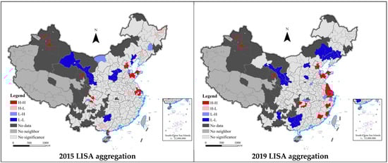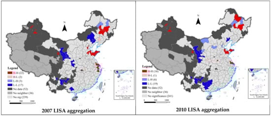 Geoda software is used to measure the local spatial autocorrelation of ecological efficiency, and ArcGIS is used to make the LISA cluster map of ecological efficiency. Figure 4 is the LISA concentration diagram of ecological efficiency under the geographical adjacency matrix, which can more intuitively reflect the current situation of regional concentration. The Moran index of local spatial autocorrelation is in the range of [−1, 1], and its spatial attributes can be divided into two positive correlation types: high–high (H-H), low–low (L-L), and two negative correlation types: high–low (H-L), low–high (L-H). High–high agglomeration indicates the spatial agglomeration characteristics of high ecological efficiency regions, while low–low agglomeration indicates the spatial agglomeration characteristics of low ecological efficiency regions. High–low concentration means that the local high ecological efficiency area is surrounded by the adjacent low ecological efficiency area, which is the embodiment of the polarization of ecological efficiency. Low–high concentration means that the local ecological efficiency is low and surrounded by areas with high ecological efficiency, which is the embodiment of the transition to high ecological efficiency. Not significant means that the ecological efficiency does not have the characteristics of spatial agglomeration, and the ecological efficiency is randomly distributed in space. From the perspective of the number change of significant ecological efficiency agglomeration, the number of cities with high ecological efficiency and high agglomeration fluctuated and increased, from 22 in 2007 to 27 in 2019. The number of low–low cluster cities has increased year by year, from 17 in 2007 to 34 in 2019. High–low concentration shows a fluctuating trend, with a small number. The number of low–high cluster cities has been relatively small, showing an upward trend, from 3 in 2007 to 7 in 2019. In terms of spatial distribution, high–high agglomeration is mainly distributed in Harbin Great Wall urban agglomeration, Beijing Tianjin Hebei urban agglomeration, Shandong Peninsula urban agglomeration, Yangtze River Delta urban agglomeration, Pearl River Delta urban agglomeration, and Chengdu Chongqing urban agglomeration. Low–low agglomeration is mainly distributed in central and southern Liaoning urban agglomeration, Beibu Gulf urban agglomeration, Xining Lanzhou urban agglomeration, and central Guizhou urban agglomeration. In the future, we should focus on breaking the low–low ecological efficiency cluster and promoting the increase of the number of high–high urban ecological efficiency clusters.