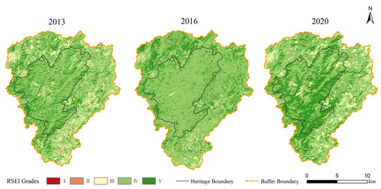 In order to more accurately reflect the characteristics of ecological environment quality changes at the Shibing Karst WNHs, the RSEI was divided into five levels of parity, with Level 1 0–0.2 (very poor), Level 2 0.2–0.4 (poor), Level 3 0.4–0.6 (moderate), Level 4 0.6–0.8 (good) and Level 5 0.8–1 (excellent). In the RSEI grade images of the study years (Figure 3), the changes in the ecological environment quality of the Shibing Karst WNHs from 2013 before the inscription to 2020 after the inscription are comprehensively illustrated. The red patches representing areas with poor to very poor ecological conditions are mainly concentrated in the southern part of the buffer zone, near the urban area of Shibing County, and have been developed intensively. The green patches, ranging from good to excellent, are widely distributed over the site, which is dominated by dolomite karst with good forest and shrub cover. The overall greening trend indicates that the ecological condition within the site is very good, while the eastern and southern areas of the buffer zone near the urban area need to be improved.