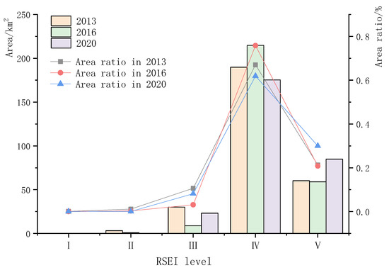 The area of each ecological status class was calculated and the data are shown in Figure 4. The area of the five areas in 2013 was 0.167 km2, 3.124 km2, 30.012 km2, 189.774 km2 and 60.222 km2, respectively. From 2013 to 2020, the fifth level increased to 84.861 km2 and the first, second, third and fourth levels decreased to 0.002 km2, 0.0981 km2, 23.076 km2 and 175.262 km2, respectively. The area of the region with poor and worse RSEI levels decreases period by period and the regional transition mainly occurs between adjacent layers, which is manifested as a transition from lower to higher levels. The main transition types are level 1 to level 2, level 2 to level 3, level 3 to level 4 and level 4 to level 5.