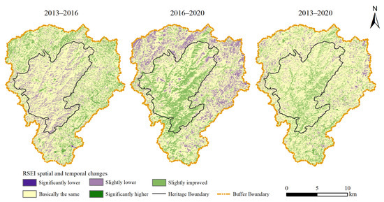 To further indicate the spatial and temporal changes in the ecological environmental quality of the heritage site, this paper analyzes the changes in RSEI values between 2013 and 2020 (Figure 5) and divides the results into five conversion levels: significantly lower, slightly lower, basically unchanged, slightly higher and significantly higher, for a comprehensive analysis of the data of the three phases of the Shibing Karst WNHs. It can be seen that, from 2013 to 2016, the ecological environment quality within the heritage site basically remained unchanged. Between 2016 and 2020, the ecological environment quality of the heritage site significantly improved and the parts that showed a decreased index were almost all within the buffer zone. Through on-site investigations and by understanding the relevant local areas, we found that both the buffer zone and the heritage site were developing tourism during this period and human activities were more obvious, which caused damage to the ecological environment in the buffer zone. In general, the ecological environment quality of the heritage site and buffer zone is improving and only in the buffer zone are there scattered areas with a decreasing trend.