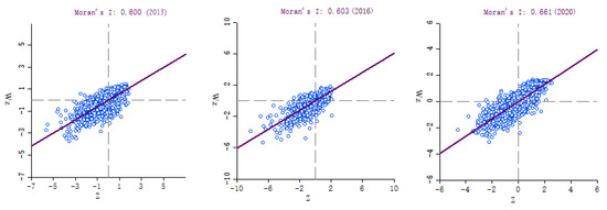 The first law of geography states that the correlation between features is related to distance and, in general, the closer the distance, the greater the correlation between features; the farther the distance, the greater the dissimilarity between features [34]; therefore, the law of spatial correlation is often used in spatiotemporal evolution studies [35] and the global Moran’s I index is used to express the global spatial autocorrelation.