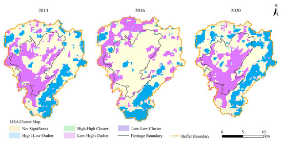 (3) The ecological environment quality shows a positive spatial correlation and the Moran index value is steadily increasing. The ecological environment quality has significant spatial aggregation characteristics, generally showing that the west side of the heritage site is more aggregated than the east side of the heritage site. The high–high aggregation is mainly distributed in the heritage site and low–low aggregation is mainly distributed in the buffer zone.