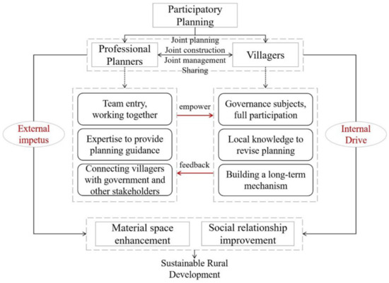 The previous government-led, top-down planning model shackles villagers’ awareness and ability to participate in planning, construction, and governance. Hence, it is difficult for rural areas to break through the development dilemma by sole internal or external power. Instead, an internal–external combined path is suggested. In this context, participatory rural planning tends to be the interaction, communication, and negotiation process between the government, rural organizations, villagers, and other stakeholders concerned, instead of mere physical construction. The priority of rural participatory planning is to retrieve the traditional collectivism in rural communities and cultivate the self-organization ability of the villagers to realize rural community sustainability. Planners should also act as advocates, mediators, coordinators, and guides rather than traditional authoritative professionals [24].