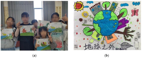 The jointly organized painting activity by planners, local village committee members, and third parties to activate children’s perceptions of their home village. (a) Some primary school students who participated with their paintings; (b) One of the paintings made by a primary school student. Source: the authors, taken in August 2022. The Chinese words in the picture serve as title, which means “Hongtang Village outside the Earth”.