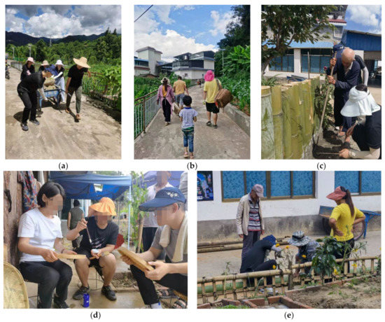 Planners working with local villagers on rebuilding their farmyards in front of their houses and behind. (a) Planning team transferring stone with villagers; (b) volunteer students carrying building materials with one local family; (c) elderly villagers assisting planners in building a fence aside the farmyard; (d) planners decorating wall art with villagers; and (e) planners building a bamboo stockade with the villagers. Source: the authors, taken in August 2022.