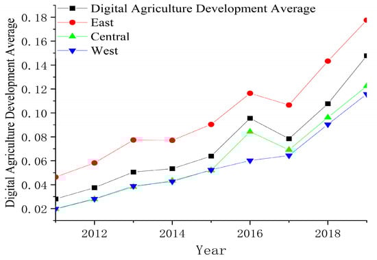 The digital agriculture development of each province was measured from 2011 to 2019, and we calculated the comprehensive index of digital agriculture advancement and the average values for the eastern, central, and western regions. According to the regional economic advancement level, we divided the provinces into three regions: east, middle, and west. There were 11 eastern provinces, including Tianjin, Beijing, Liaoning, Hebei, Fujian, Jiangsu, Shanghai, Shandong, Zhejiang, Hainan, and Guangdong; the central region covered eight provinces, including Shanxi, Henan, Anhui, Jiangxi, Heilongjiang, Jilin, Hunan, and Hubei; and the western part covered 11 provinces, including Inner Mongolia, Yunnan, Gansu, Shanxi, Guangxi Sichuan, Qinghai, Ningxia, Chongqing, Guizhou, and Xinjiang. The specific composite indices for each province and distribution area are provided in the following Table 2.