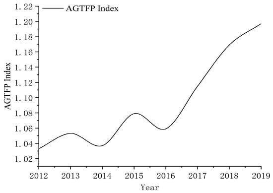 From Figure 2, we can see that, during the research period, China’s AGTFP index showed an overall steady growth, with an overall average value greater than one and a yearly growth rate of about 2.05% on average. From the figure, it can be seen that the general trend fluctuated up and down from 2012 to 2016, with an upward trend after 2016. The reason may be that the concept of green production in agriculture during the study period was still in the primary stage while, since 2016, the relevant guidance programs and agricultural green ecological subsidy policies such as “Zero Growth Use Program of Fertilizer Use by 2020” and “Zero Growth Use Program of Pesticide Use by 2020” were introduced to encourage localities to advocate green and environmentally friendly production patterns.