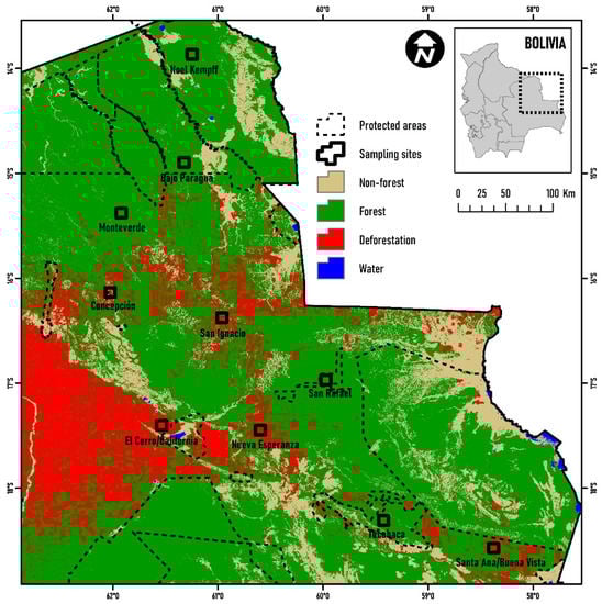 Globally, estimates indicate that between 1982 and 2016, the largest net loss of tree canopy in the tropical region occurred in the tropical dry forest biome (−8%), while the largest net loss of tree canopy occurred in the tropical dry forest biome (−2%) [13]. The main causes of disturbance in these forests are associated with commodity-driven deforestation, silviculture, shifting agriculture, and wildfire [14]. In South America, the area of natural tree cover decreased by 16%, while the use of grasslands, croplands, and plantations increased considerably [15]. Recent global studies highlighted the tropical forests of Brazil and the Chaco of Argentina, Paraguay, and Bolivia as the most threatened forest ecosystems in the world due to recent agricultural expansion. In Bolivia, the area identified with the highest growth in deforestation is the Chiquitano Forest [16,17] due to the rapid expansion of the mechanized agricultural and livestock frontier [18,19]. Currently, the drivers of the rapid and recent increase in deforestation in the Chiquitano Forest are the combined effect of soy expansion, the consolidation of corporate land holdings, and the increase of degraded soils in productive areas [19]. In the Department of Santa Cruz, where the main extension of the Chiquitano Forest in Bolivia is located, the annual rate of deforestation reached −0.16% until 2019 [20], mainly caused by an expansion of cattle ranching, medium- and large-scale mechanized agriculture, and small-scale agriculture [18,19]. Despite this factor, 70.7% of the forests are of great importance in terms of forest area in the region, with three non-fragmented stands of more than two million hectares that represent the largest proportion with 57.9% [21]. If the current trend of forest loss in Santa Cruz continues, it is expected that by 2050 the forest area will be reduced from 25.1 million to 12.8 million hectares, mainly in the Chiquitania region [20].