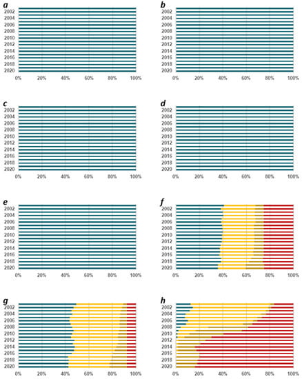 Our results show that the five sites with forest did not feature variations in the percentages over the 20 years of analysis (Figure 3). However, the urban areas of San Ignacio and Concepción showed a reduction in forest areas and savannas but an increase in grasslands. In the case of El Cerro/California, the forested area was completely reduced, while grasslands and croplands increased. The area of Nueva Esperanza was the most strongly impacted and the area of Santa Ana/Buena Vista reduced its forest cover from 100 to 61% (Figure 3).