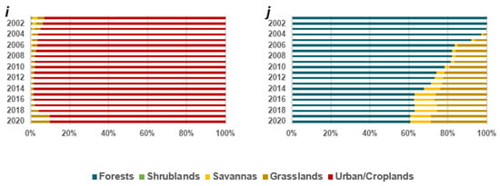 Annual percentage of land cover type in forested and deforested areas in the Chiquitania region (2001–2020). Sites with intact forest: (a) Noel Kempff, (b) Bajo Paraguá, (c) Monteverde, (d) San Rafael, and (e) Tucabaca. Sites with deforestation: (f) San Ignacio, (g) Concepción, (h) El Cerro/California, (i) Nueva Esperanza, and (j) Santa Ana/Buena Vista.