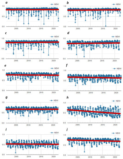 Trends in NDVI time series in forested and deforested areas in the Chiquitania region (2001–2021). The red line represents the trend line of the data points. Sites with intact forest: (a) Noel Kempff, (b) Bajo Paraguá, (c) Monteverde, (d) San Rafael, and (e) Tucabaca. Sites with deforestation: (f) San Ignacio, (g) Concepción, (h) El Cerro/California, (i) Nueva Esperanza, and (j) Santa Ana/Buena Vista.