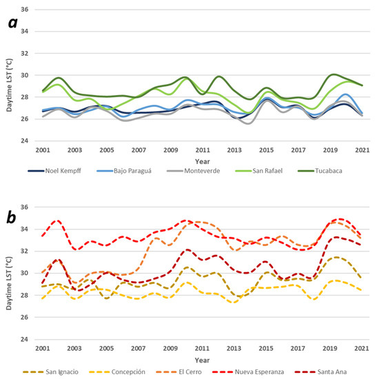 Average annual daytime LST (°C) in forested areas (a) and deforested (b) areas in the Chiquitania region (2001–2021).