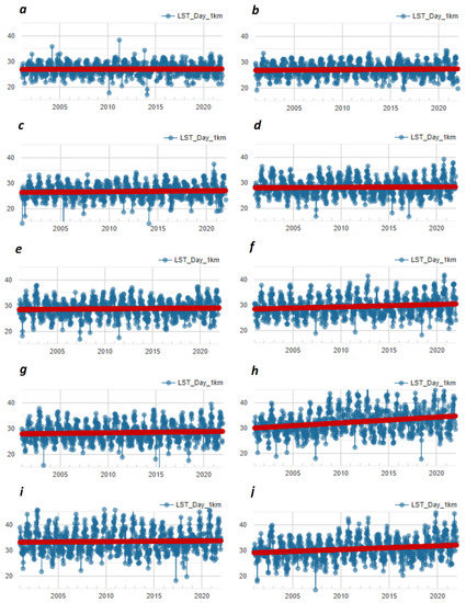 Time series trends in daytime LST (°C) in forested and deforested areas in the Chiquitania region (2001–2021). The red line represents the trend line of the data points. Sites with intact forest: (a) Noel Kempff, (b) Bajo Paraguá, (c) Monteverde, (d) San Rafael, and (e) Tucabaca. Sites with deforestation: (f) San Ignacio, (g) Concepción, (h) El Cerro/California, (i) Nueva Esperanza, and (j) Santa Ana/Buena Vista.