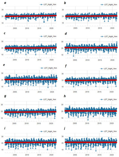 Trends in the time series of nighttime LST (°C) in forested and deforested areas in the Chiquitania region (2001–2021). The red line represents the trend line of the data points. Sites with intact forest: (a) Noel Kempff, (b) Bajo Paraguá, (c) Monteverde, (d) San Rafael, and (e) Tucabaca. Sites with deforestation: (f) San Ignacio, (g) Concepción, (h) El Cerro/California, (i) Nueva Esperanza, and (j) Santa Ana/Buena Vista.