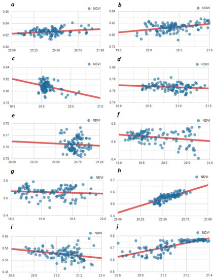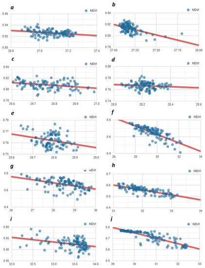 Relationship between NDVI and nighttime LST (°C) values in forested and deforested areas in the Chiquitania region (2001–2021). The red line represents the trend line of the data points. Sites with intact forest: (a) Noel Kempff, (b) Bajo Paraguá, (c) Monteverde, (d) San Rafael, and (e) Tucabaca. Sites with deforestation: (f) San Ignacio, (g) Concepción, (h) El Cerro/California, (i) Nueva Esperanza, and (j) Santa Ana/Buena Vista.