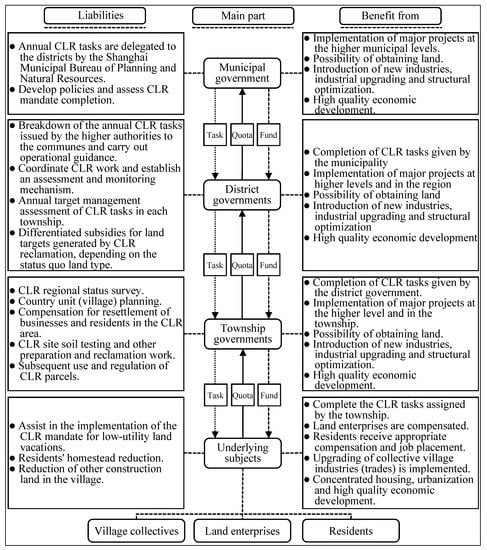 The CLR process involves three levels of government—municipal, district and township—and three types of underlying subjects [11,14]. Village collectives, land enterprises and residents are the base subjects most affected by CLR [9,15]. In the CLR process, the tasks of CLR are decomposed from top to bottom (municipal government → district governments → township governments → underlying subjects), and the land quotas formed by CLR are collected, managed and deployed for use from bottom to top (underlying subjects → township governments → district governments → municipal government), while the compensation funds for CLR are passed and accumulated from top to bottom (municipal government → district governments → township governments → underlying subjects) for passing and accumulating at each level. See Figure 1 for details.