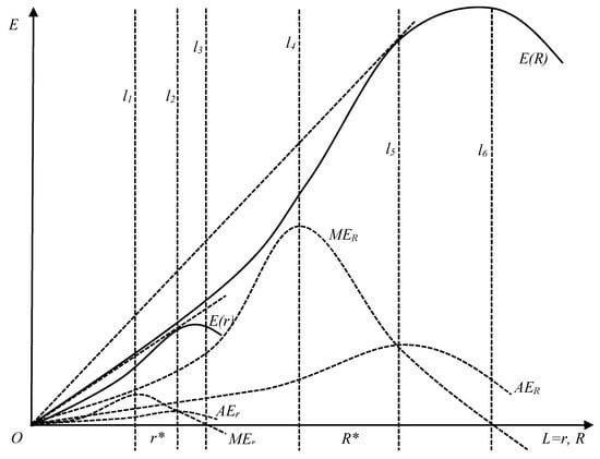 In Equations (1)–(3), λ r is the benefit coefficient of the townships and the underlying subjects, r is the use radius of land quotas obtained by CLR by the government departments at the township level and below, and E r is the expected benefit to the government departments at the township level and below. E r is the logistic function of r , which is in the increasing stage at this stage. R is the use radius of land quotas obtained by CLR by government departments at the district level and above, and E R is the expected gain for government departments at the district level and above. E R is the logistic function of R , which is in the increasing stage at this stage. The schematic diagram is shown in Figure 2. The horizontal axis represents the use radius of the land quotas obtained by the CLR, M E and A E , which denote the marginal and average benefits corresponding to each use radius, respectively. The benefit coefficients for government departments at the district level and above in the CLR area are below.