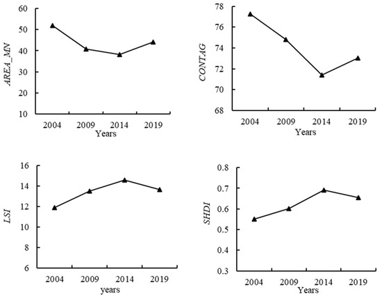 Landscape pattern indices are indicators designed to quantitatively describe and analyze landscape patterns and their changing characteristics, reflecting certain aspects of landscape structural composition and spatial configuration [27]. There are many landscape pattern indices, and some of them are highly correlated. This study analyzes the change of landscape pattern in the study area from the four aspects of landscape fragmentation degree, shape complexity, heterogeneity, and connectivity. Combining the existing research results [28] and actual needs, this paper selects four indicators: average patch area (AREA_MN), landscape shape index (LSI), Shannon Diversity Index (SHDI), and contagion index (CONTAG); these representative indicators can objectively and accurately describe the evolution of regional landscape patterns. The formulas and ecological significance of each landscape pattern index can be found in other works in the literature [29]. On the basis of the land use landscape classification results (30 m × 30 m) of the four phases of remote sensing images, the various types of landscape pattern indexes in different years in the study area were calculated in Fragstats4.2 software.
