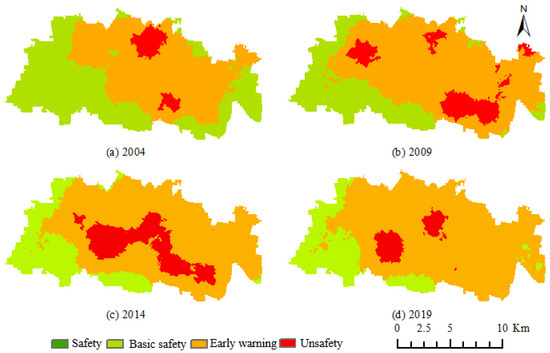 - The ecological safety of the landscape in the study area shows obvious spatial and temporal changes. In the time dimension, the overall ecological safety of the landscape in the study area from 2004 to 2019 shows a change characteristic of first becoming worse and then gradually improving. The area of the basic safety zone keeps decreasing, the area of the warning zone keeps increasing, while the area of the unsafe zone shows the characteristic of first increasing and then decreasing; on the spatial scale, the unsafe zone in 2004 is distributed mainly in the south and north of the study area. By 2019, the area of the unsafe zone in the study area was significantly reduced by the influence of land remediation and reclamation.