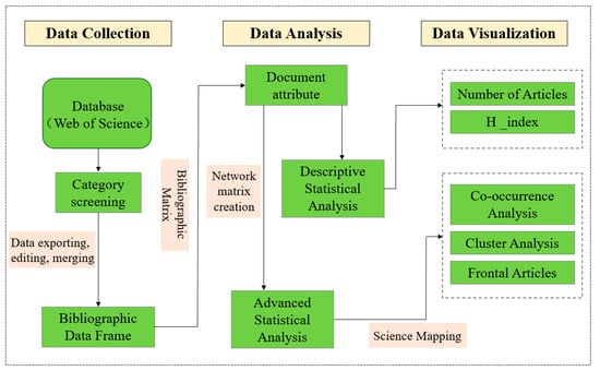 The quantitative analysis software Bibliometrix was used to carry out qualitative and quantitative literature research on land consolidation and rural revitalization. By identifying past and current research topics, bibliometric analysis quantitatively and objectively provides a comprehensive analysis of a huge amount of publications [62]. The Bibliometrix R package is an open-source environment and system written in the R language, which is a useful tool for the quantitative analysis of scientific literature [63]. Compared with other languages, the R language has more efficient statistical algorithms, access to high-quality numerical equations, and integrable data visualization tools [64]. Biblioshiny was developed by Massimo Aria in the R language in the secondary development of the Bibliometrix-based shiny package [65,66]. It contains the core code of Bibliometrix and creates a framework for data analysis based on online databases [67]. Users can perform relevant scientific metrology and visual analysis on the interactive web interface [68,69], which, to a certain extent, reduces the use threshold and the information input intensity [70]. Bibliometrix boasts better visualizations, especially in keyword co-occurrence analysis [71]. Figure 1 shows the Bibliometrix workflow.