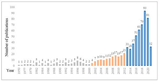 Analysis of the distribution of publications from the time series demonstrates the research trend (Figure 2). From 1950 to 2021, the number of publications on land consolidation and rural revitalization fluctuated slightly, with an overall increase. According to the changes in respective macro-policies, the period can be divided into three stages: from 2000 to 2012, and from 2013 to 2021. The period from 1950 to 2000 was the initial period, with a small number of publications per year. From 2001 to 2012, although the number of publications increased slowly, a stable state was reached, indicating that this field has attracted widespread attention. The period from 2013 to 2021 was the high production stage, with a rapidly increasing number of publications, peaking in 2018 with 93 articles.
